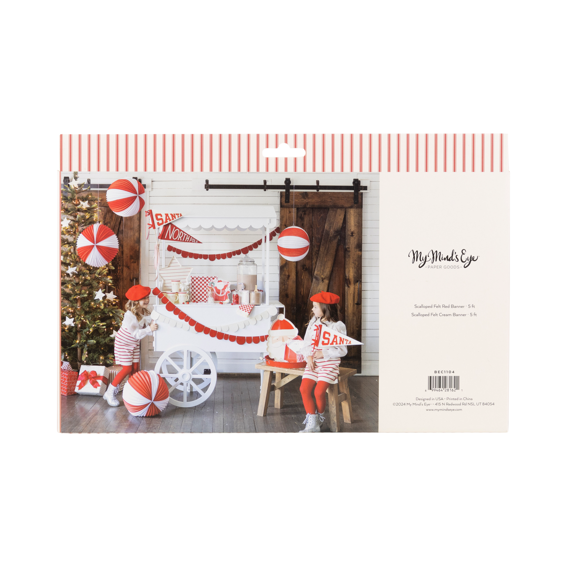 • Includes 2 felt banners, one red and one cream; approximately 5' long