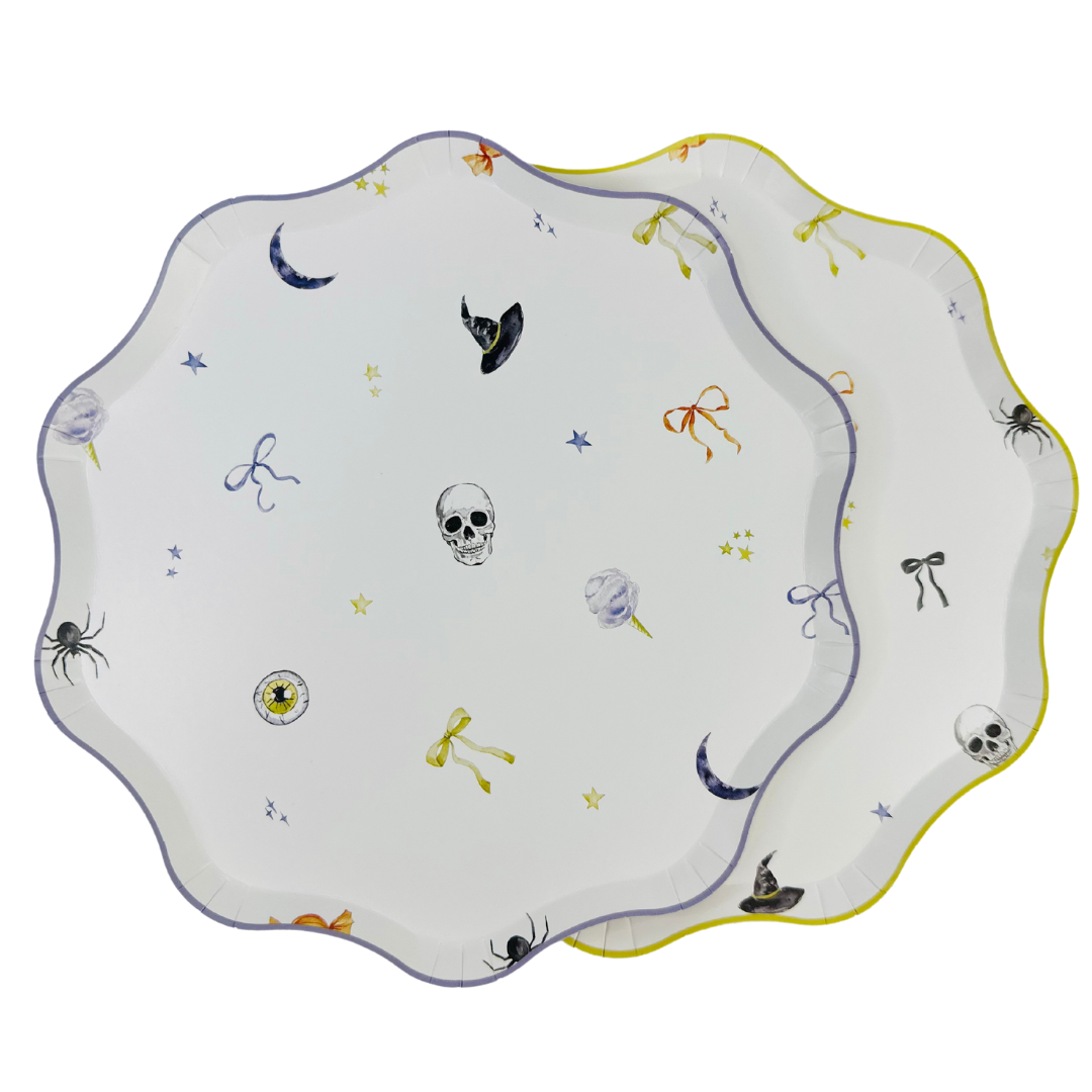 Adorable watercolor Halloween patterned plates, bows, skeletons, witch's hats, spiders and more! Size: 8.5 Inch 12 Plates 6 Purple Trimmed Plates, 6 Chartreuse Trimmed Plates Per Pack