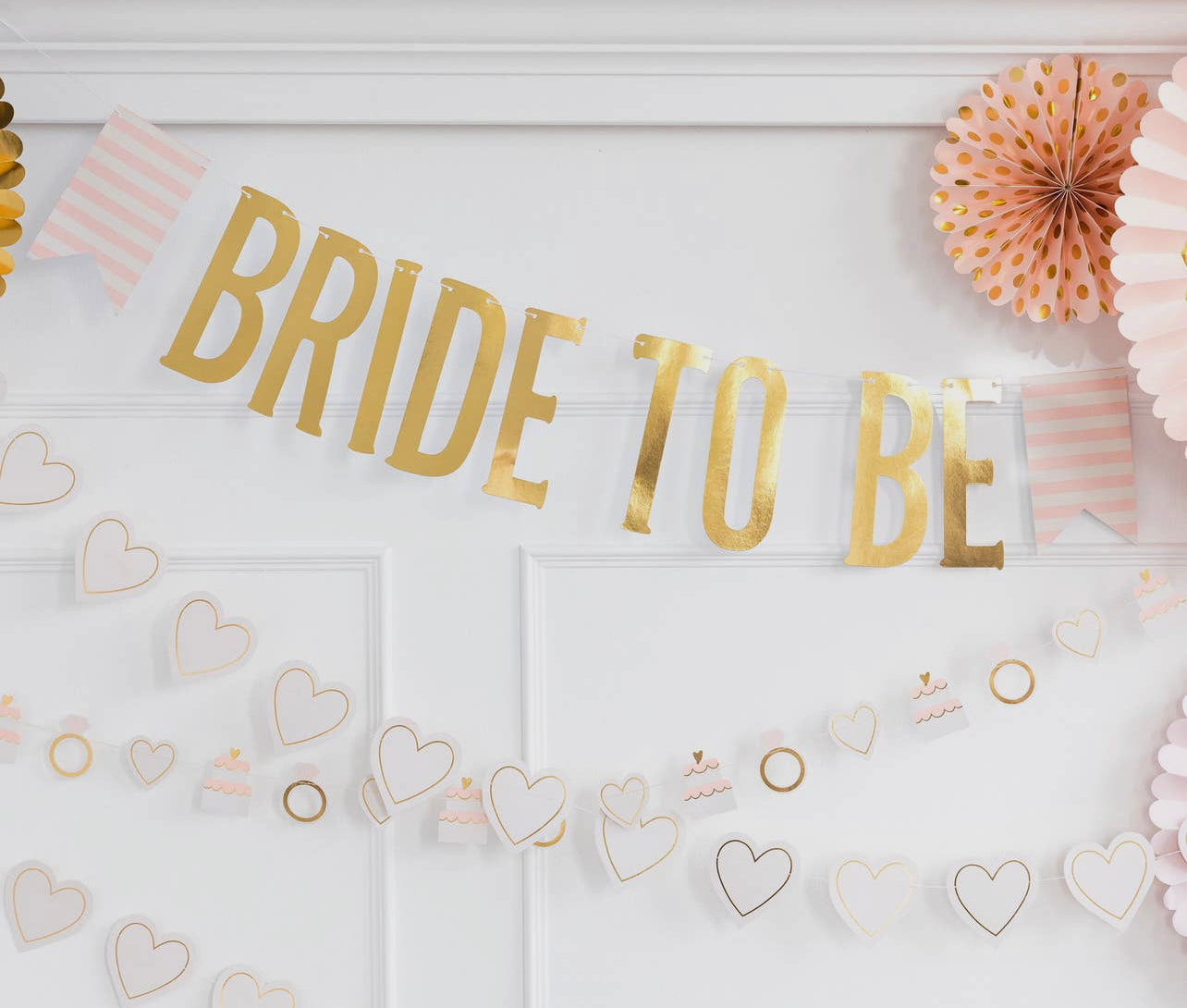 This gold foil banner includes the letters to complete the phrase "BRIDE TO BE" and 2 striped pennant banners, pres-trung, making hanging it up a snap!