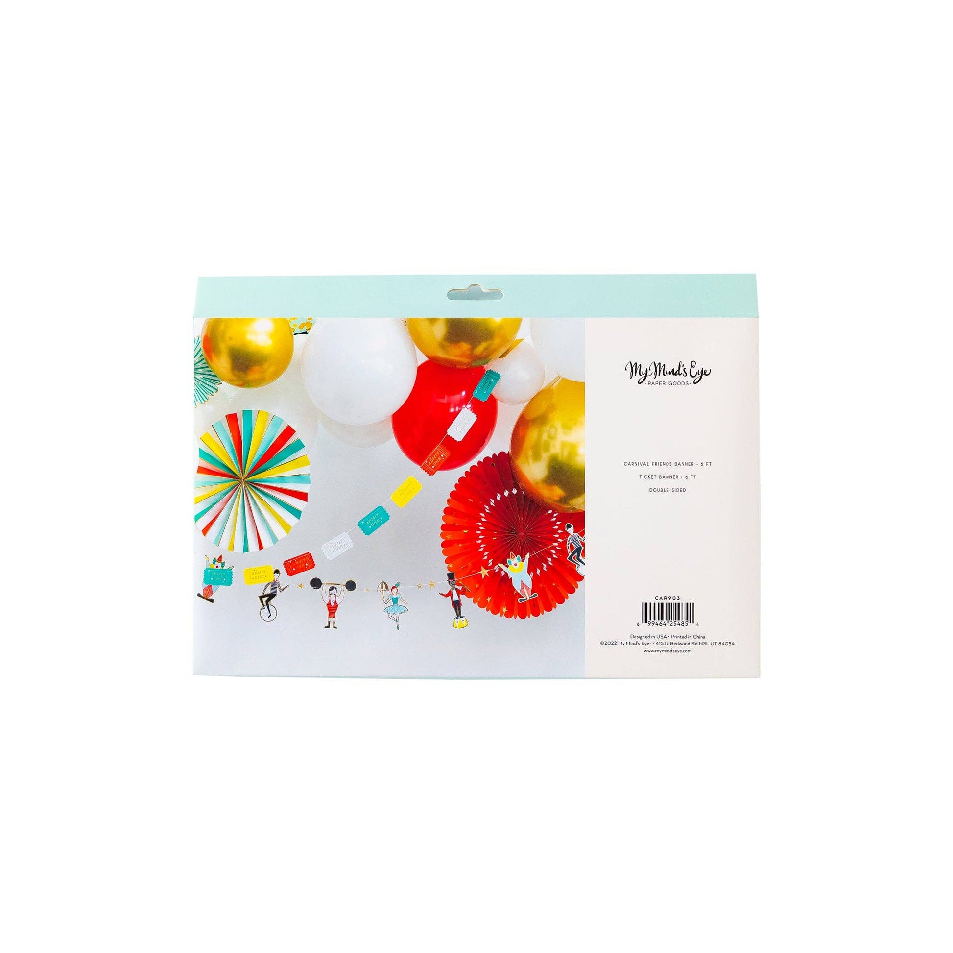Set right up to the party with this whimsical carnival inspired banner set. Featuring a banner full of a cast of carnival characters that are a stand out with their gold foil accents. Also included in this banner set is a ticket banner that insures that you are admitted to all the fun!