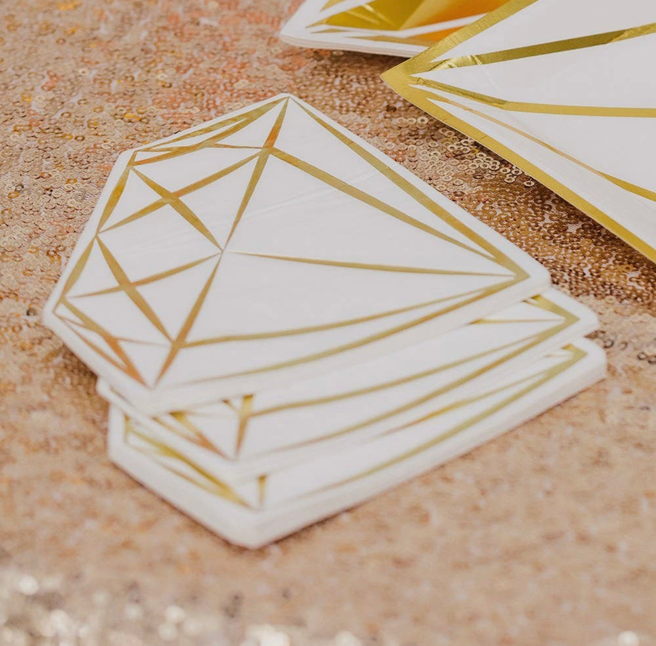 A must-have party essential, paper napkins are a fun and easy way to enhance your party décor and these metallic gold foil, white, diamond napkins are the perfect, inexpensive serviettes to do just that!
