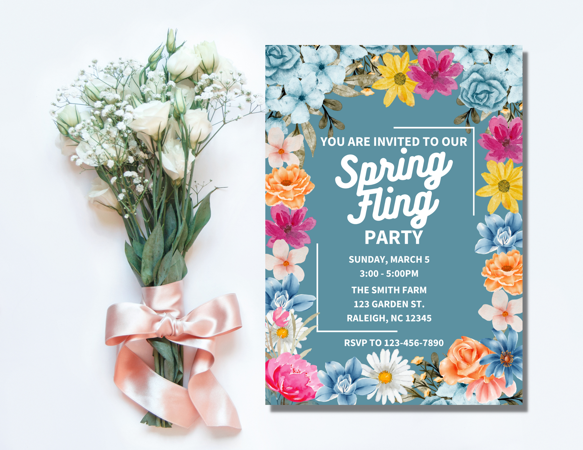 Spring is right around the corner and when you think of Spring, you think of flowers! With a dark blue background, the blooms POP on this Spring Fling invitation.