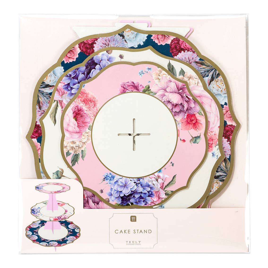 Truly Scrumptious Double-Sided Floral Cake Stand. This pretty cardboard cake stand is perfect to display sweet or savory treats from sandwiches to cupcakes and pastries! This vintage style cake stand is double sided making sure it will compliment any color scheme and can be used more than once. Ideal for a range of occasions including a Birthday Party, Kid's Tea Party, Mother's Day Table or even a Baby Shower. Pair with our vintage party decorations and tableware including matching plates, napkins and bunting.