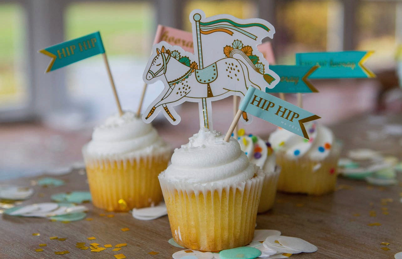 Create the most fabulous cupcakes with a complete cupcake set including gold wrappers and assorted horse and flag toppers for themed cakes that will look beautiful among your party food spread. Packed in beautiful custom packaging.