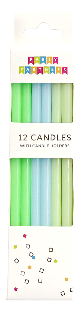 Green & Blue 12 Candle Set with candle holders for perfect placement. Size: 3.5” tall Add a stylish touch to any cake with our 12 Green & Blue Cake Candle Set, complete with white candle holders for perfect placement every time.