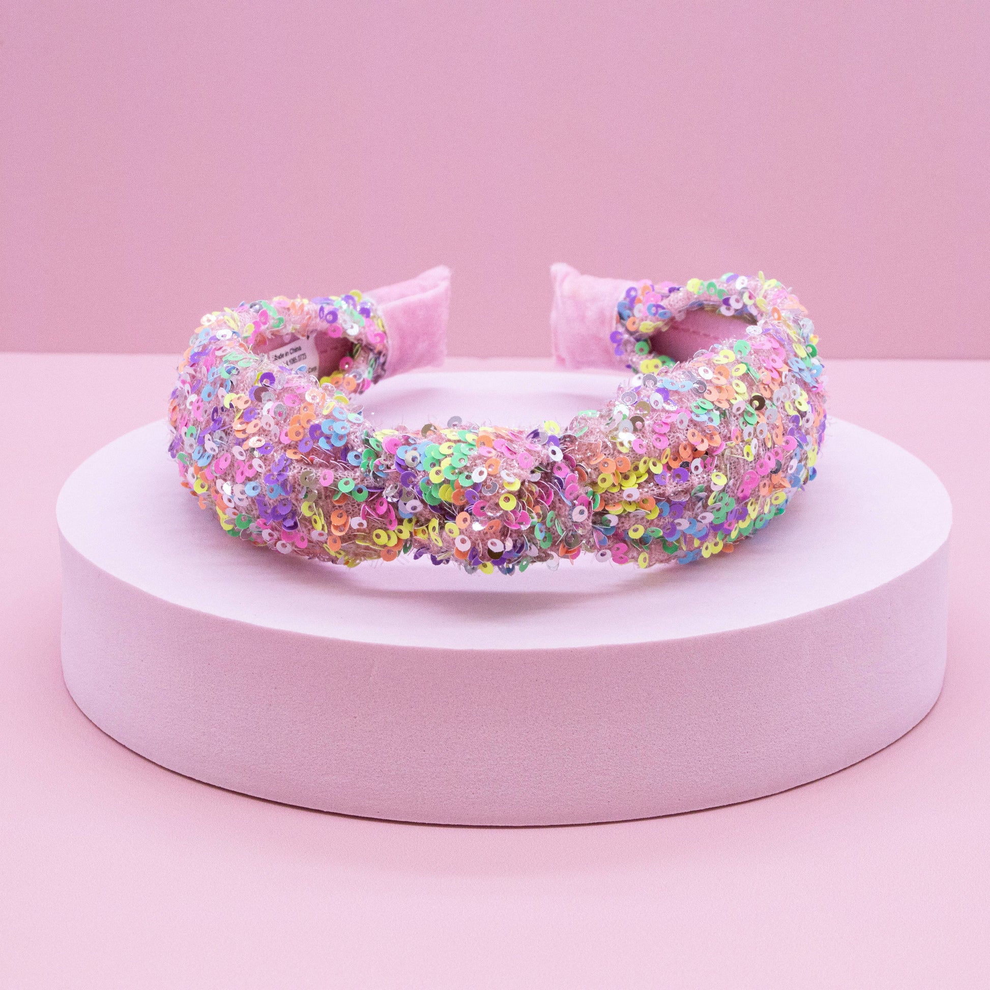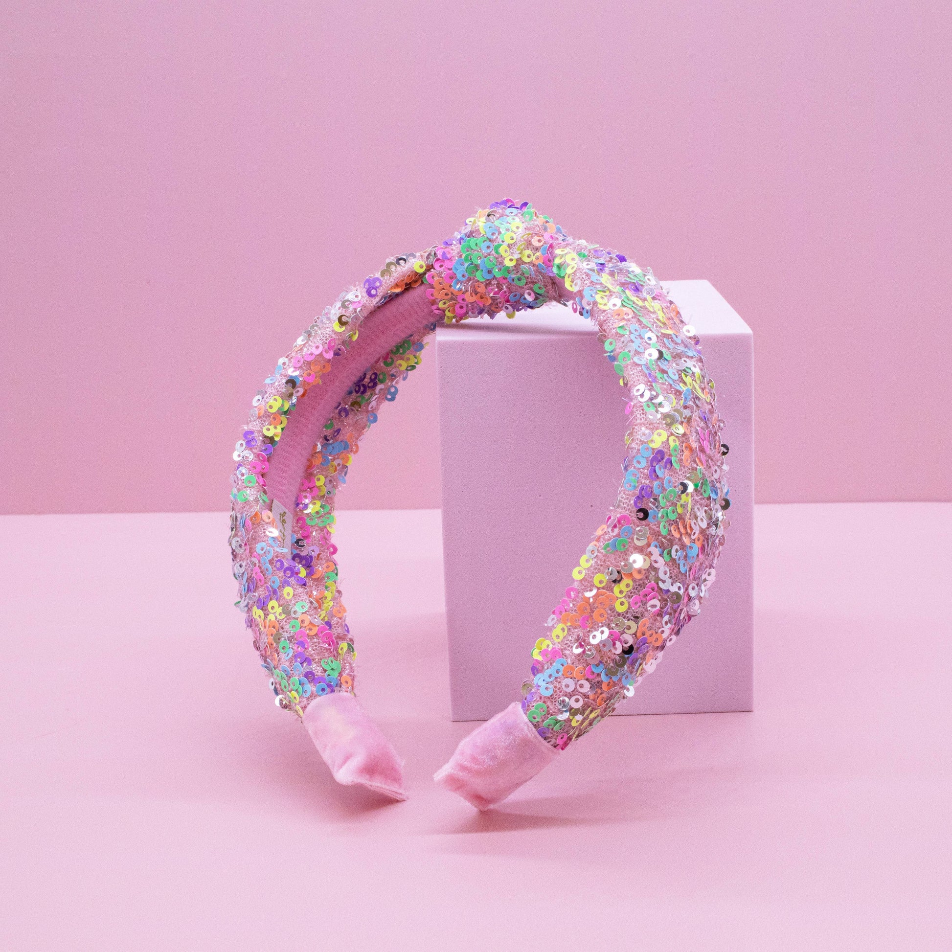 Confetti sequin knot headband with shimmering iridescent sequins *