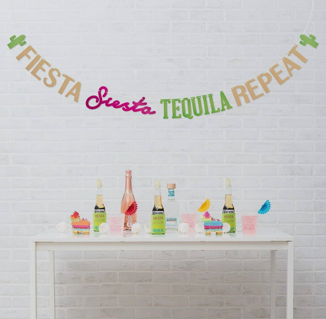 Deck out your party with this cool, metallic gold paper banner. The "Fiesta Siesta Tequila Repeat" word pennants are a fun, decorative way to welcome your guests and pull together a fiesta bachelorette, bridal shower, or birthday party theme.