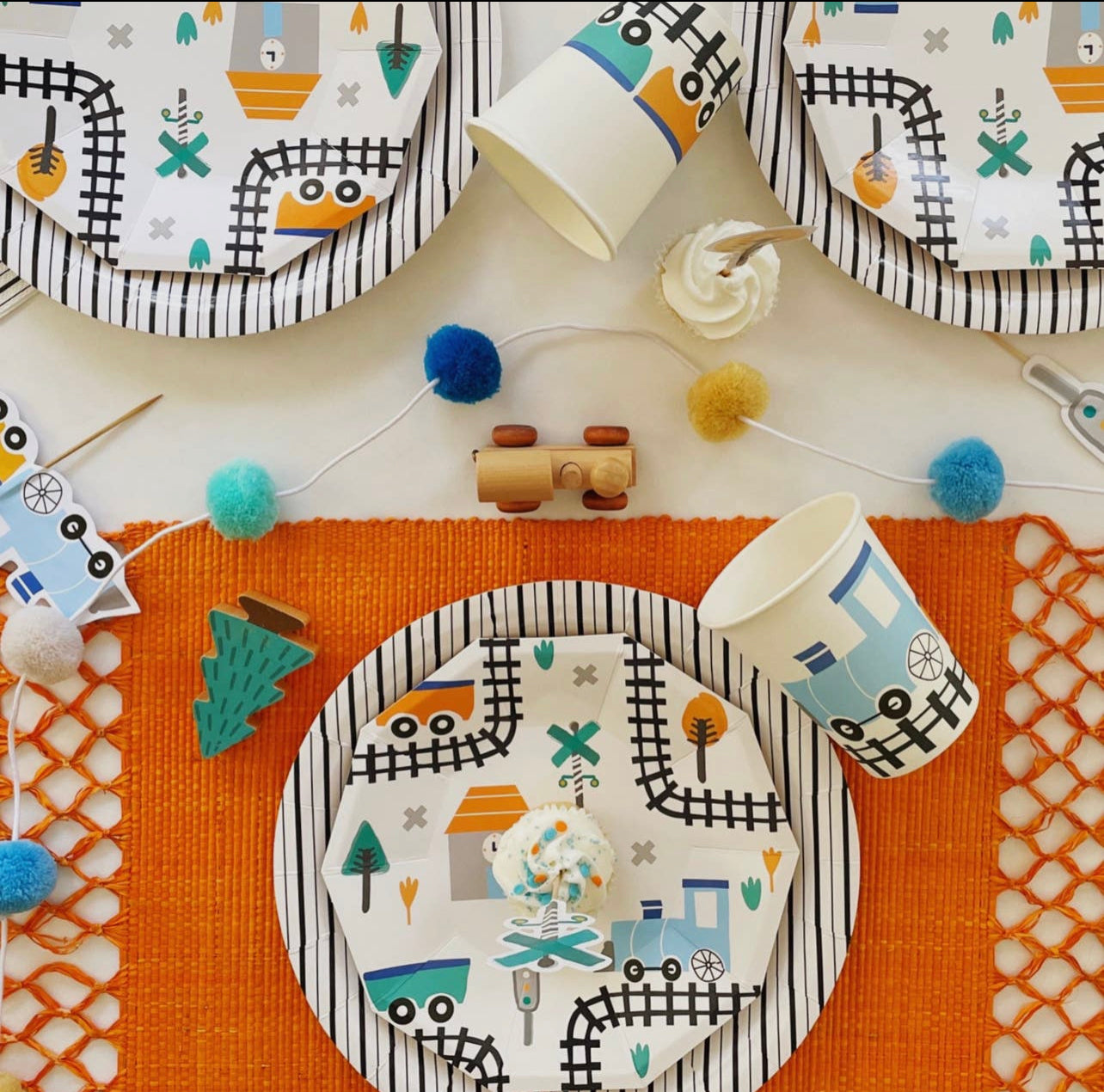 Steam Train coming through! All aboard! Featuring blue, green and orange colors, these train plates will make your train party the most stylish.