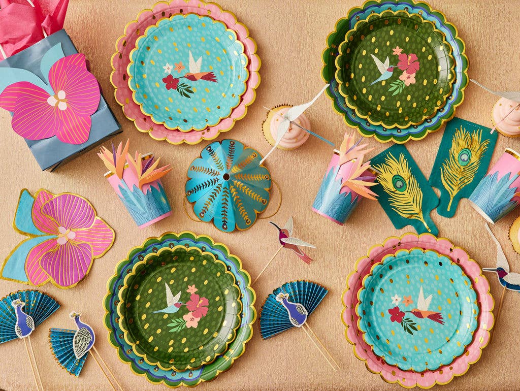 These custom-mold floral paper napkins are shaped like a tropical orchid in rich shades of teal, cerise, and gold.
