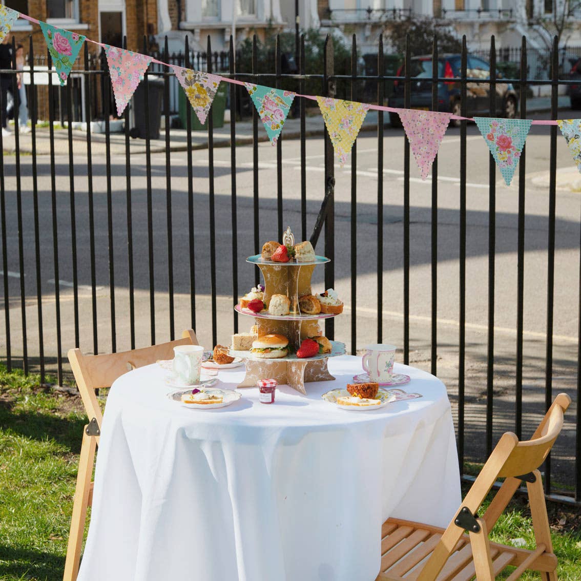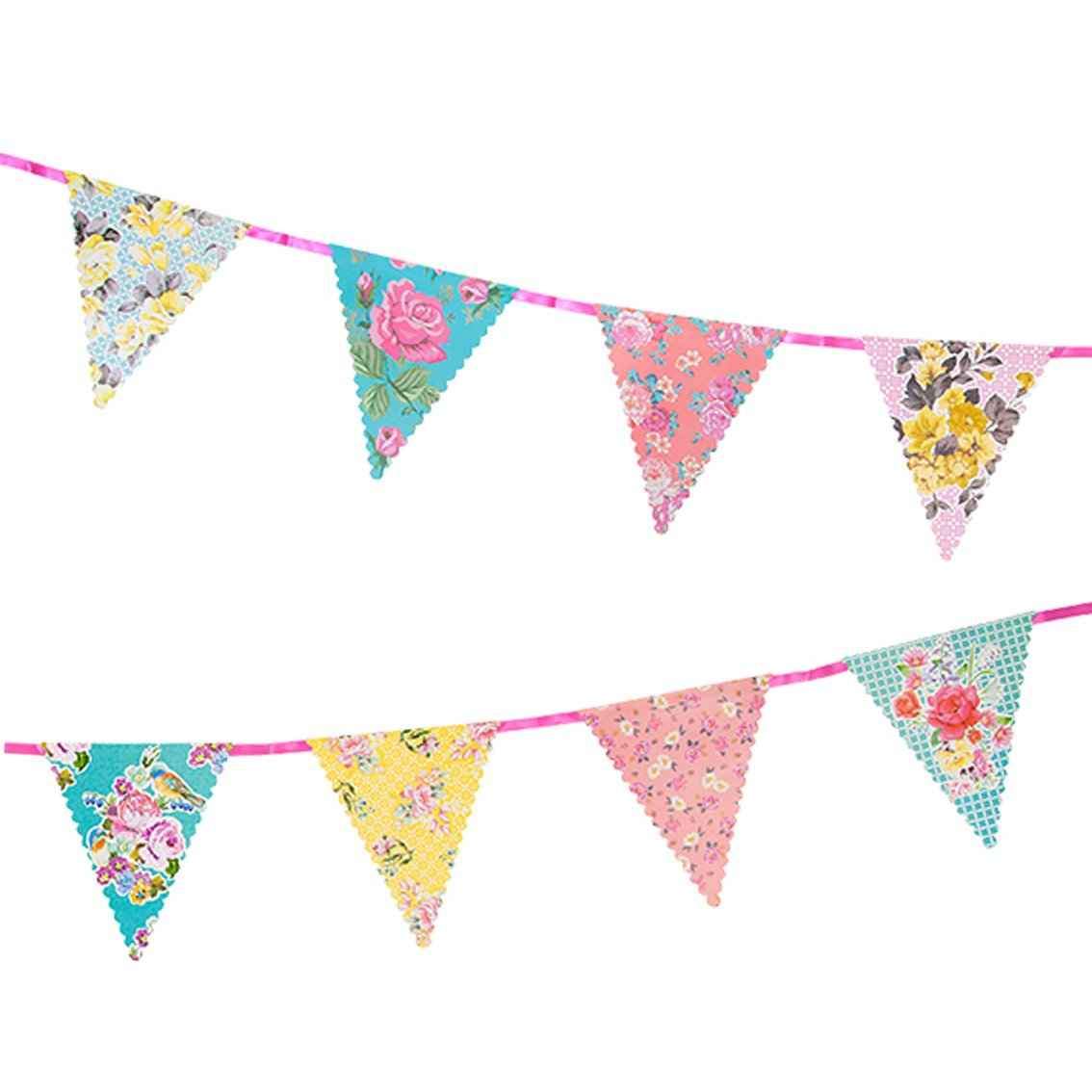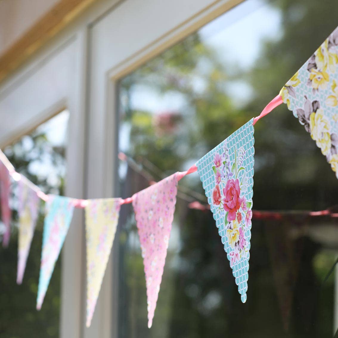 Vintage style colorful floral bunting by Talking Tables. The pretty paper bunting is sure to catch the eye of your guests. Simply hang this party decoration across the ceiling, on the wall or in the garden to create a chic atmosphere! Perfect for a Birthday Party, Afternoon Tea Party, Garden Party, Mother's Day or Wedding. Pair with our best selling Truly Scrumptious collection for matching vintage party decorations and disposable tableware. Each pack contains bunting, with 16 pennants of paper bunting in 8 different designs.
