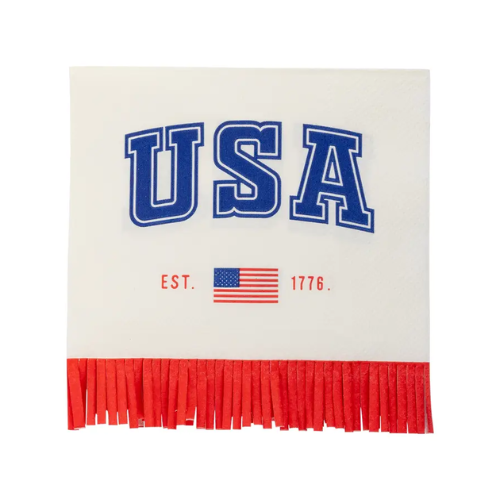 Celebrate in style with our USA Fringe 1776 Paper Cocktail Napkin! This playful napkin features a unique fringe design and proudly displays the USA flag. Perfect for any patriotic occasion, add some fun and flair to your party with our USA-themed napkin.